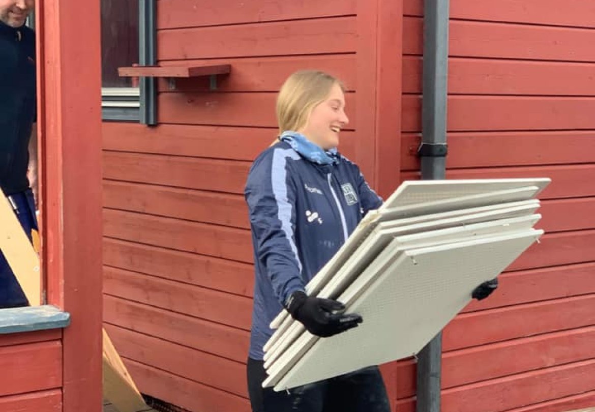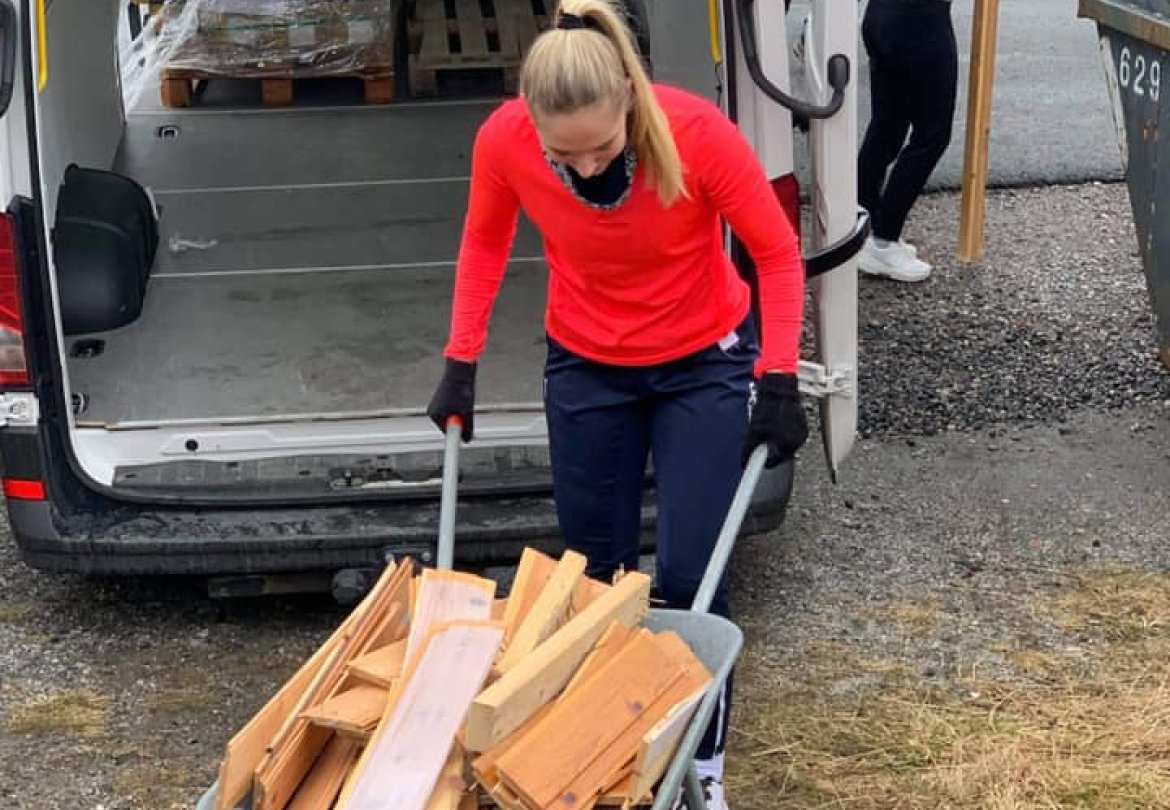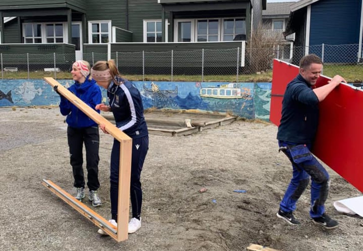 Vanlig trening ble erstattet med styrketrening i arbeidsklær. 290 pakker med flis gitt i gave fra Flisforum skulle bæres på plass, samt riving og bæring til containere. Dugnadsarbeidet pågår for fullt i påvente av at entreprenør får påbegynt sitt arbeid.