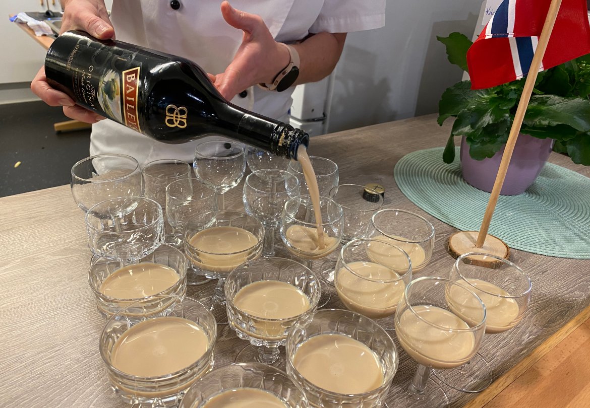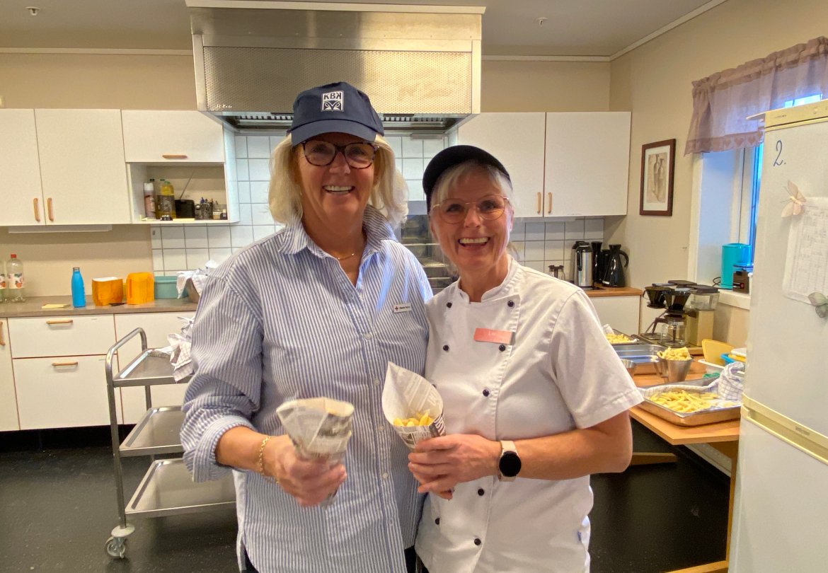 - I dag skal vi skal vi se interjvu med KBK-trener Amund Skiri, og vi skal synge med på mange fine KBK-sanger, forteller aktivitør Torill Alstad og leder an i allsangen. Imens brer det seg deilig duft av nystekt chips, for på kjøkkenet lager kokk Liv Aandahl og frivillig fra Røde Kors, Birgit Flatsetøy snacks for alle pubgjestene. Og i glassene serveres det bobler, øl, vin og avslutter med kaffe og likør.