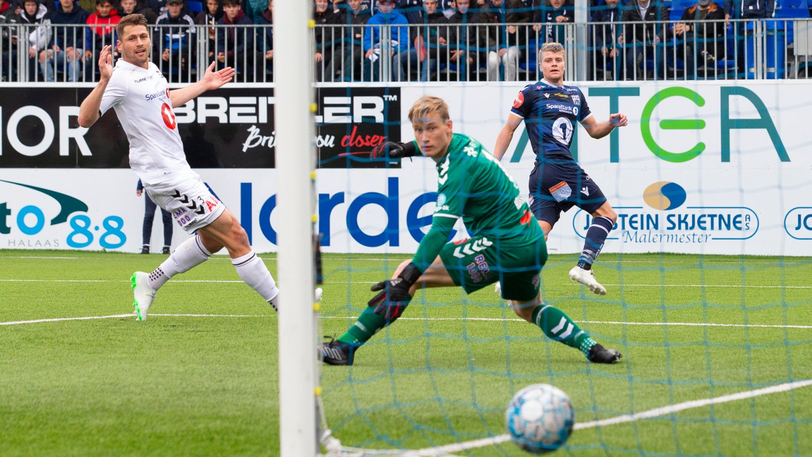 Etter 35 minutter får gjestene nok en stor sjanse. Delavaris mottar et innlegg fra høyre og kommer til avslutning kloss hold, men nede ved stolpen varter Mbaye opp med en meget sterk reaksjonsredning!