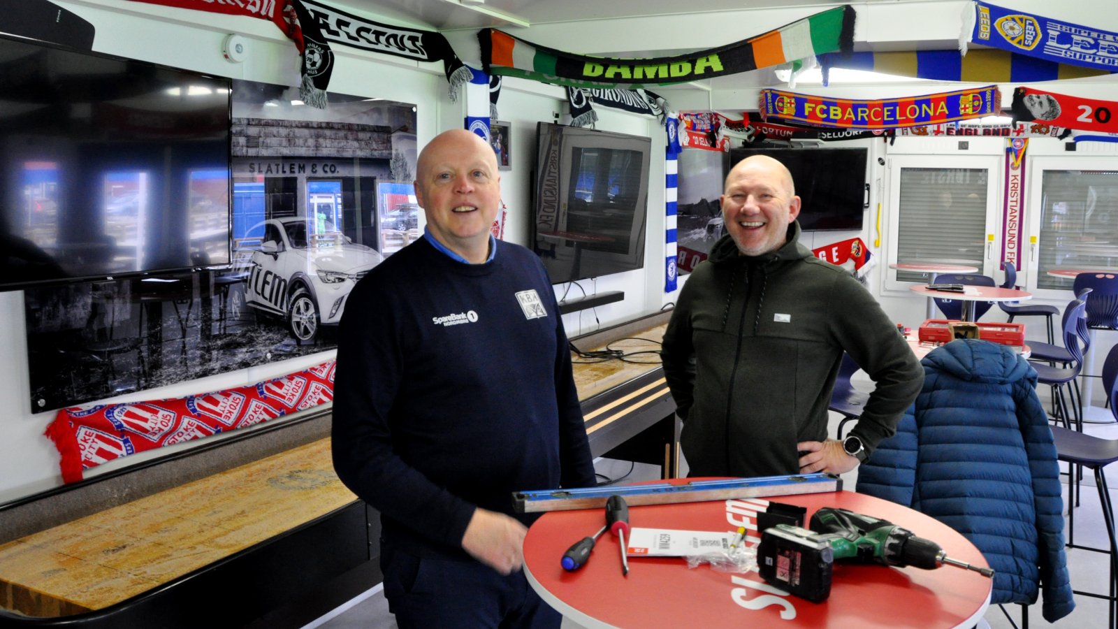 Sammen med pubsjef på bortekampvisninger, Edvin Torkildsen, skrudde han opp skjermene på tirsdag. Neste mulighet for et besøk på Slatlem Corner er på lørdag, når KBK spiller bortekamp mot Mjøndalen. Avspark er klokken 15.00, og puben åpner dørene kl. 13.30.