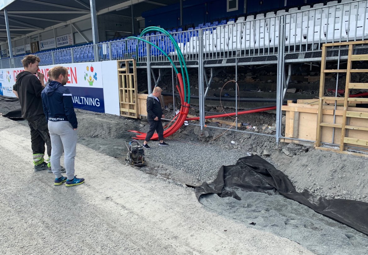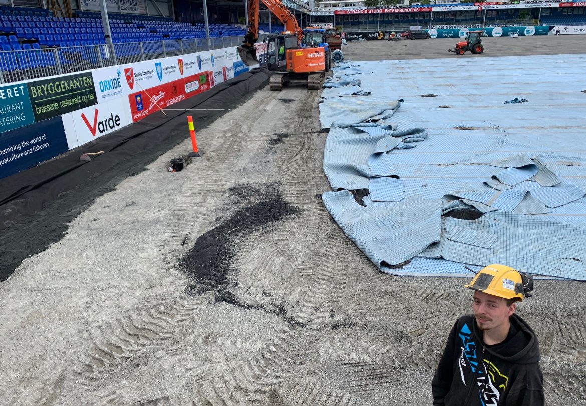 - «Vi skal i tillegg grave en grøft langs Abyss-tribunen, hvor varmekablene skal legges ned. Dette blir et stort løft for stadion, og vi får det beste kunstgresset markedet har å by på. Nå er det bare å håpe at været er med oss de neste to ukene, så blir dette riktig så bra. Alt har gått etter planen så langt, og vi gleder oss til å se sluttproduktet.» avslutter Helland.