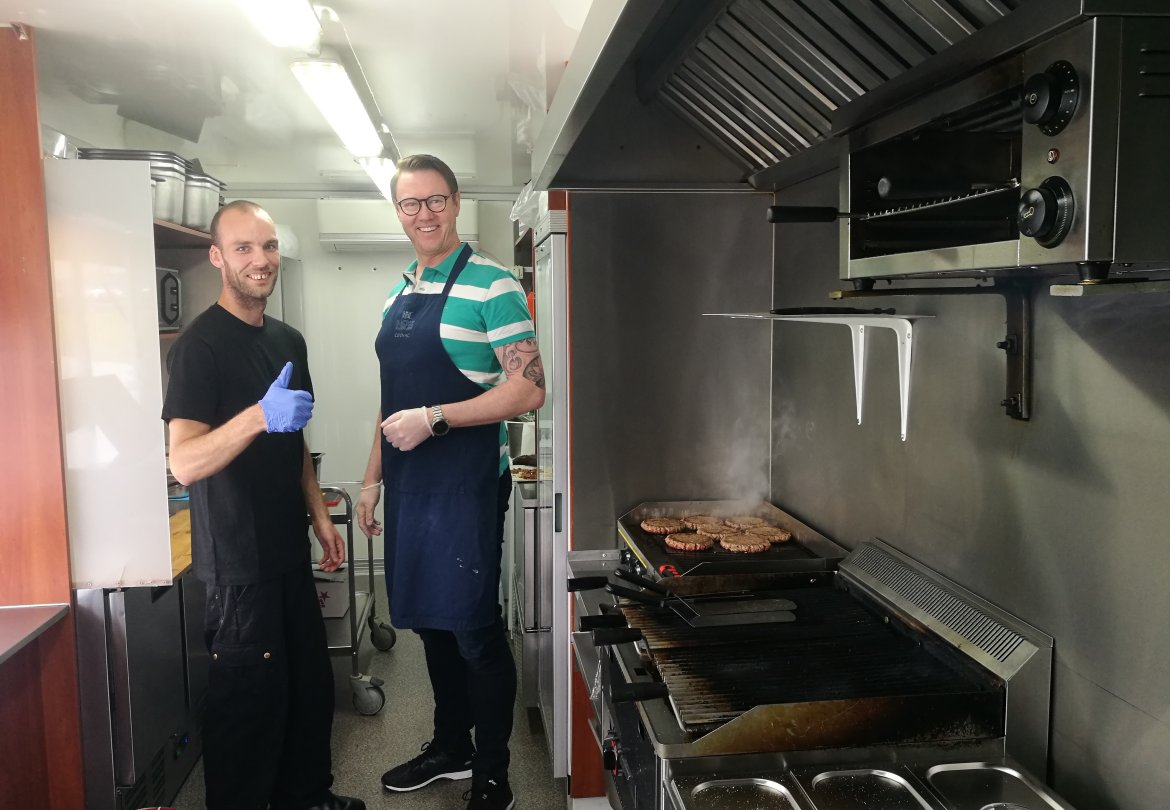 Arild Dybvik serverte burgere i fleng sammen med flittige burger-kokker inne i burgervognen, som inneholder et moderne og funksjonelt kjøkken.