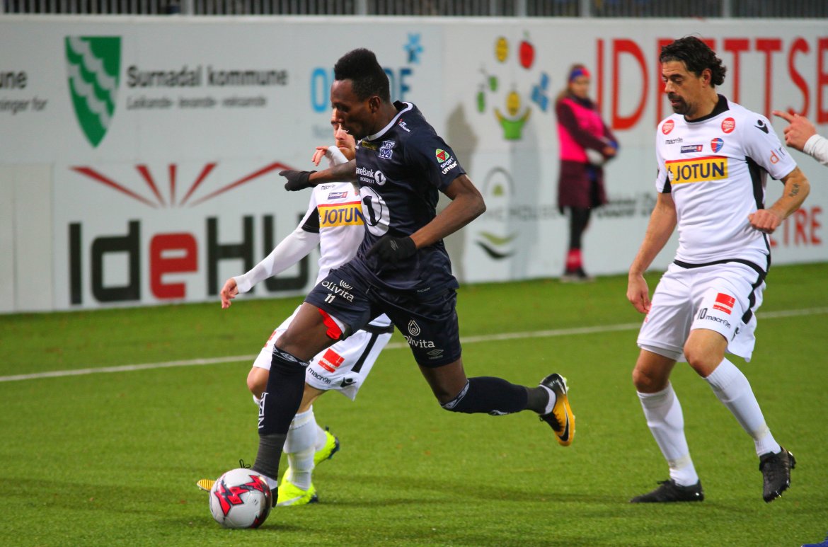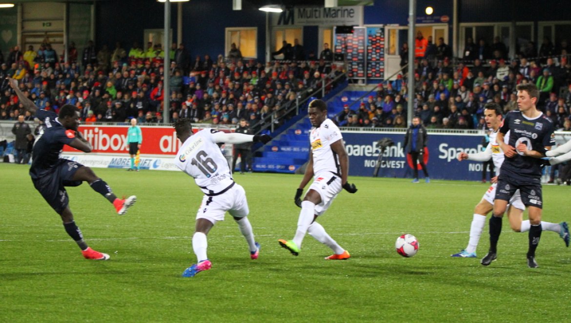 Rett før pause er Dao Bamba nær ved å øke til 3-1. Spissen utfordrer Sandefjord-forsvaret på fart. Det er enkel match, og han sklir forbi stopperne før han sender en avslutning 30 cm til venstre for krysset fra ti meter. KBK veldig nær, men lagene tar pause på stillingen 2-1.