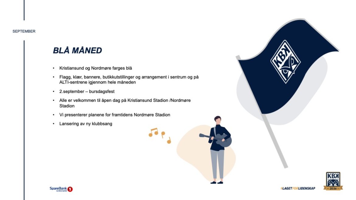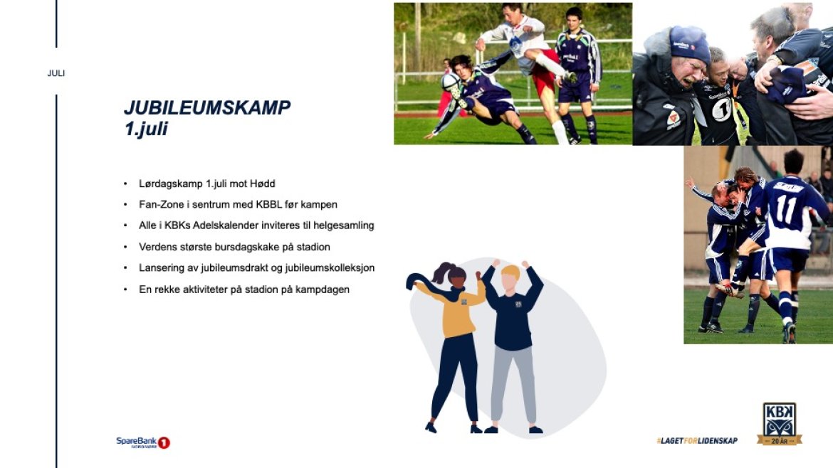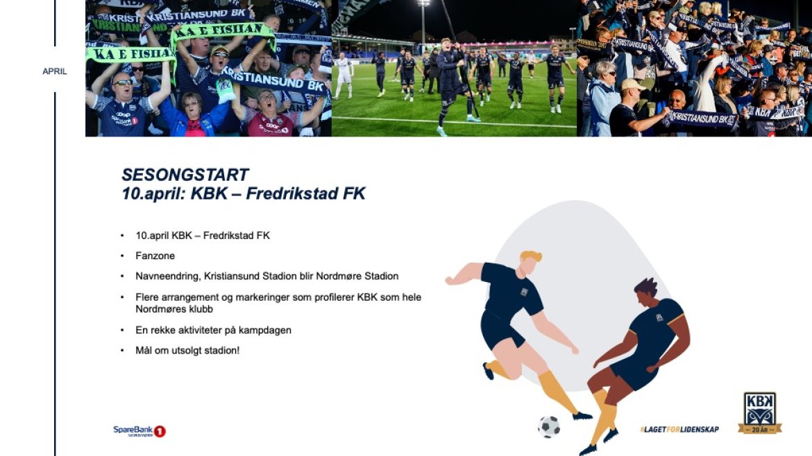 Gjennom et vanlig fotballår har vi et enormt antall aktiviteter i vår klubb. Også i år skal vi begeistre Nordmørspublikumet både på og utenfor banen. Aktiviteter som fotballkamper i OBOS-ligaen, til sammen ca 130 kamper som skal spilles av alle klubbens lag, fotballskoler, klubbesøk, fanzone, gatelagsturnering, sponsorarrangement – det blir mange anledninger til å dele mye moro sammen med KBK. I tillegg skal vi som det seg hør og bør når vi har bursdag, feire med brask og bram! Jubileumsåret krydres med mye gøy, og i dag ble alt dette presentert for klubbens samarbeidspartnere.
