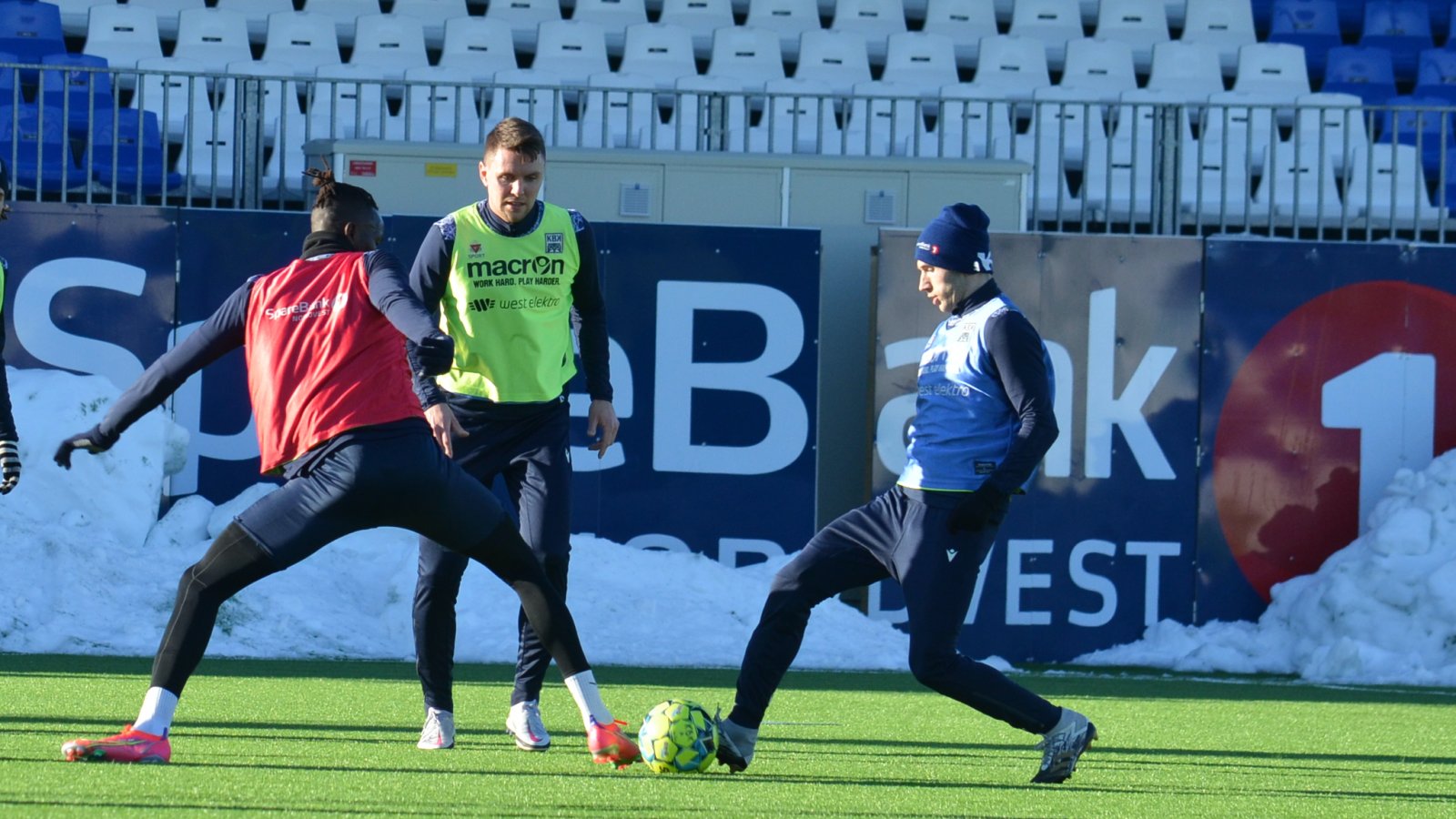 Sola strålte på stadiongresset, og gradstokken viste endelig noen plussgrader. Treningen var også preget av god temperatur, konkurranse og kamp om ballen kombinert med et lekent lagspill slik vi liker det. Og Liridon Kalludra som dagens blå joker mellom gult og rødt lag!