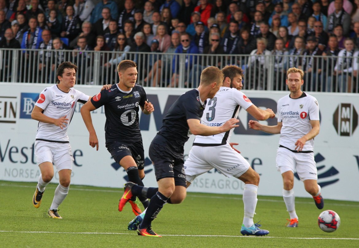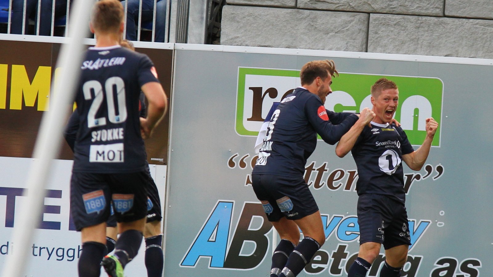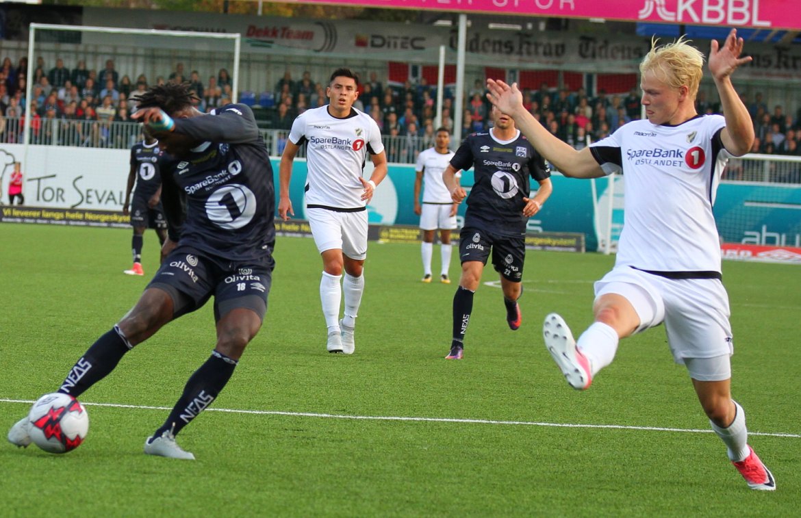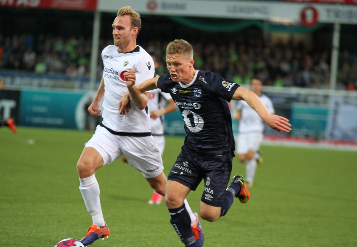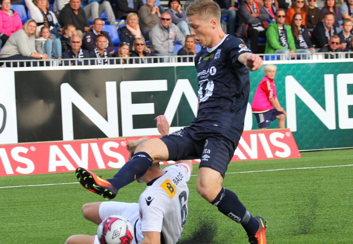 KBK åpnet friskt, og virket pigge når de angrep. Etter 13 minutter skjer det som får 3874 tilskuere til å ta fullstendig av på tribunen. KBK byr på flott angrepsspill når Stokke trer gjennom Gjertsen i 16-meteren. Kantspilleren avslutter i steget fra skrå vinkel til venstre i feltet, og triller inn sin andre scoring siden han kom til Mørekysten i sommer. 1-0, og KBK får en pangstart på kampen.