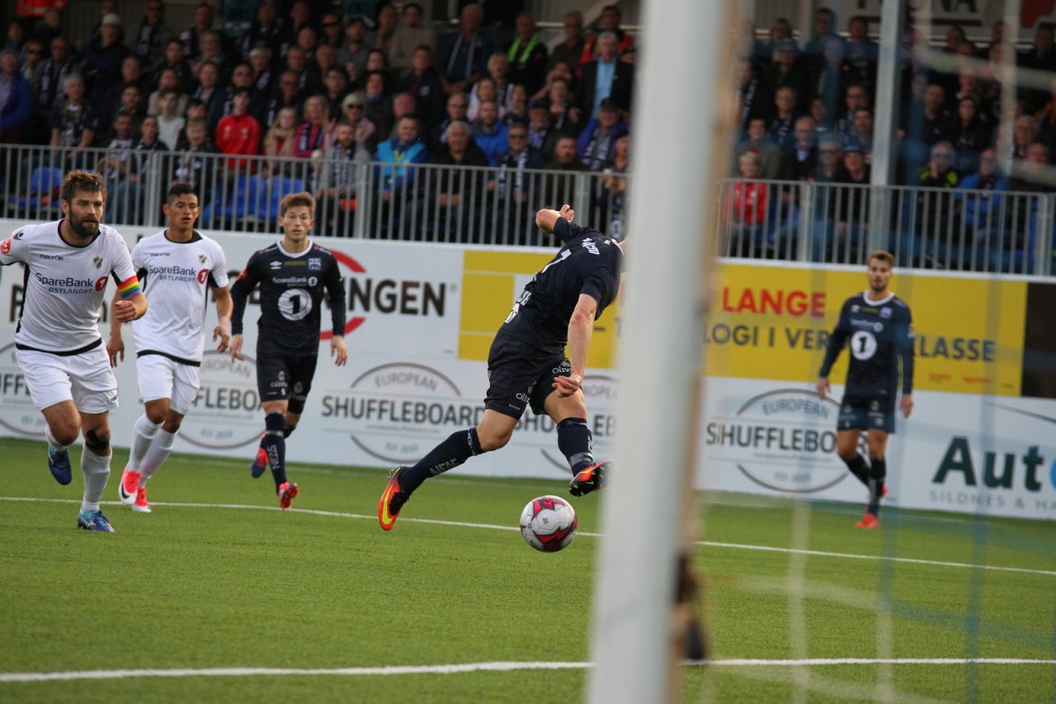 Eliteseriens toppscorer Ohi Omoijuanfo trer frem for å ta straffen. Spissen prøver å vente ut Sean McDermott, men sisteskansen er med på notene - går riktig vei og redder straffen! Full kok og enorm jubel på tribunene.