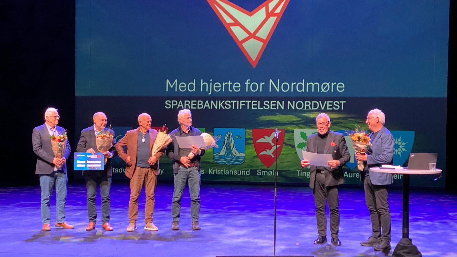 Daglig leder i Sparebankstiftelsen Nordvest, Odd Einar Folland, deler ut ekstra heder og priser til utvalgte prosjekt med gavesjekk, blomster og applaus hvert år. I år gikk dugnadsprisen til Anders Istad og Roald Røsand for dugnadsgjengen bak Nordmøre Arena på Averøy.