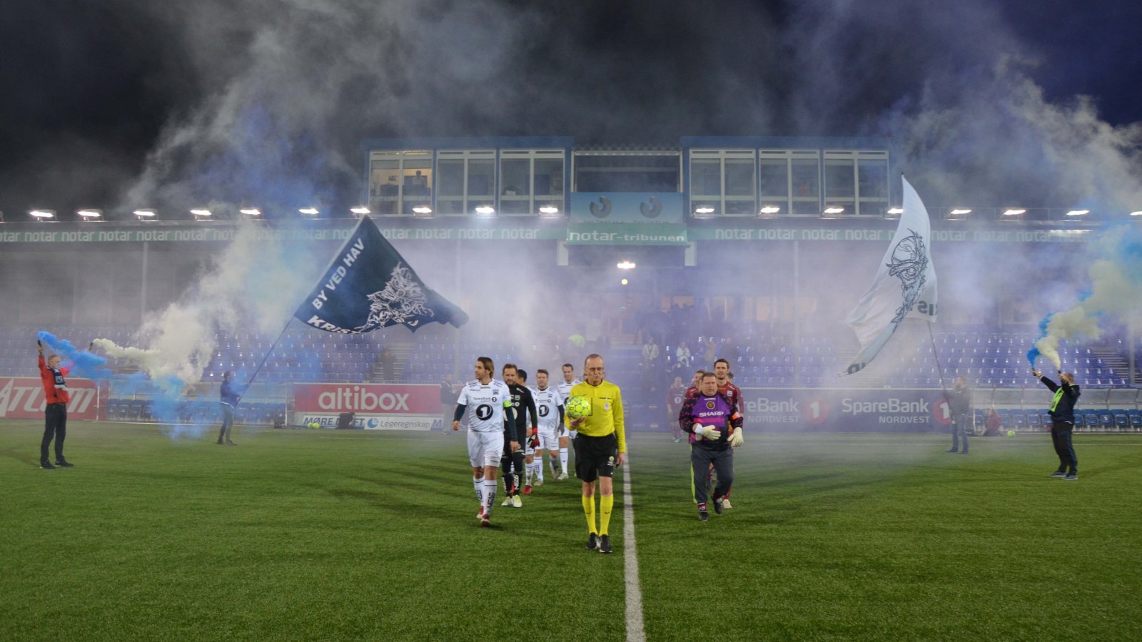 Samarbeidspartnerne ble møtt med ferdig preppet garderober, og kledde seg opp i KBK-utstyr fra topp til tå. Dommer Tor Sunde ledet lagenes utmarsj med bravur til eliteseriehymnen på stadionanlegget. Uglan supporterklubb hadde møtt opp for å lage stemning med både røykbomber, sang og tromming. Fantastiske bilder!