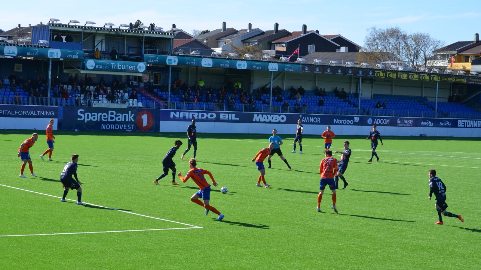 Elsker ballsund by runger over stadion og siste treningskamp er i gang! Det er strålende sol og fine forhold på Kristiansund Stadion.
