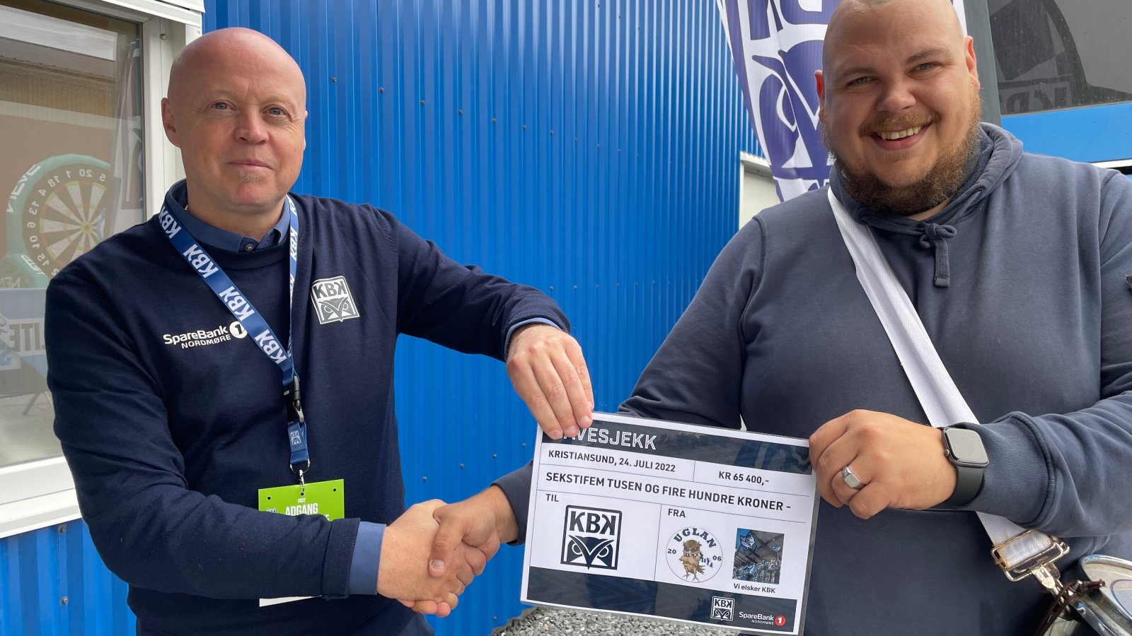 Daglig leder Kjetil Thorsen fikk overrekt gaven på vegne av KBK. Thomas Helge Strømskag som gir gaven på vegne av alle som har deltatt på spleisen er stolt av engasjementet til supporterne.