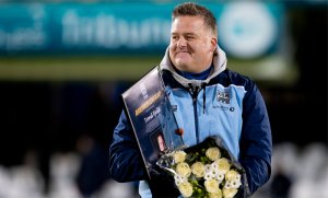 Keepertrener Trond Hjelle mottok etter kampslutt i går æresmedlemsskap i Kristiansund Ballklubb.